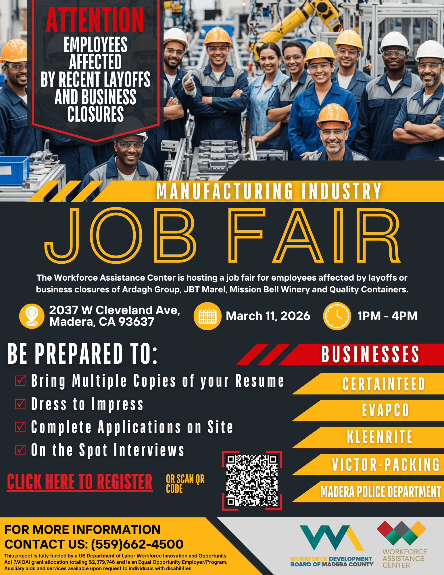 Happening Wednesday, March 11, 2026, at the Madera County Workforce Assistance Center starting at 1:00 pmThis event is specifically for individuals who have been impacted by recent layoffs or business closures.Have questions? Call or email for all the details: