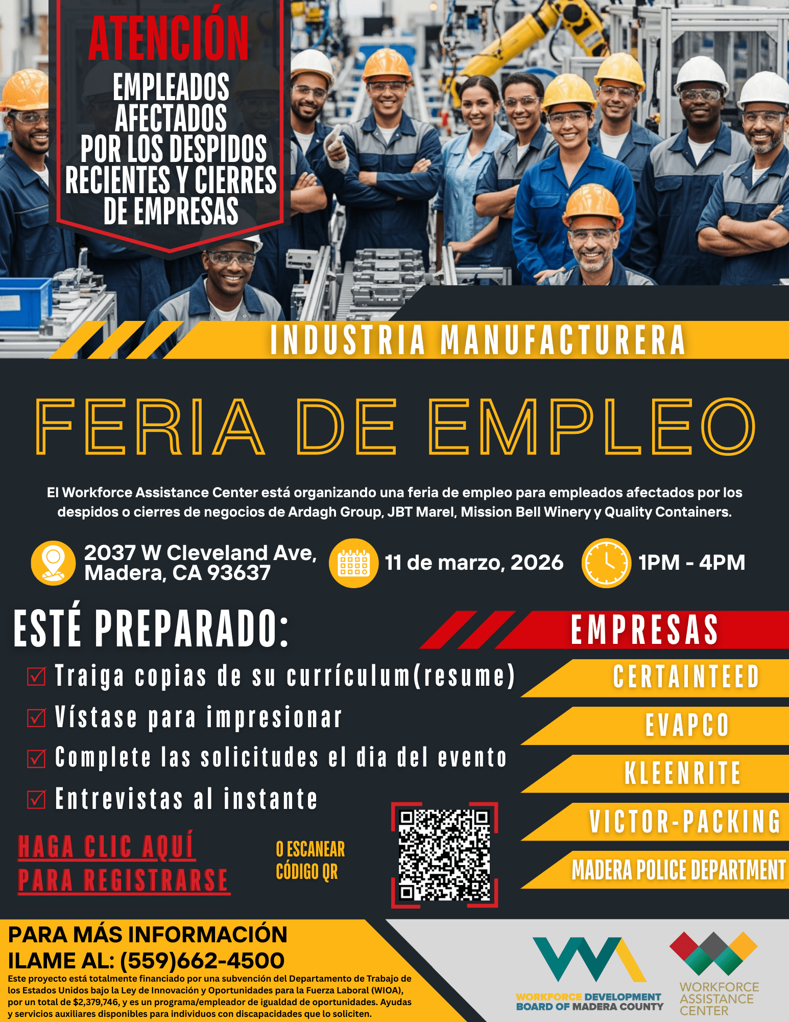 Se llevará a cabo el miércoles 11 de marzo de 2026 en el Madera County Workforce Assistance Center,comenzando a la 1:00 p.m.Este evento está dirigido a personas que han sido afectadas por despidos recientes o por el cierre de su empresa.¿Tiene preguntas? Llame o envíe un correo electrónico para más información: