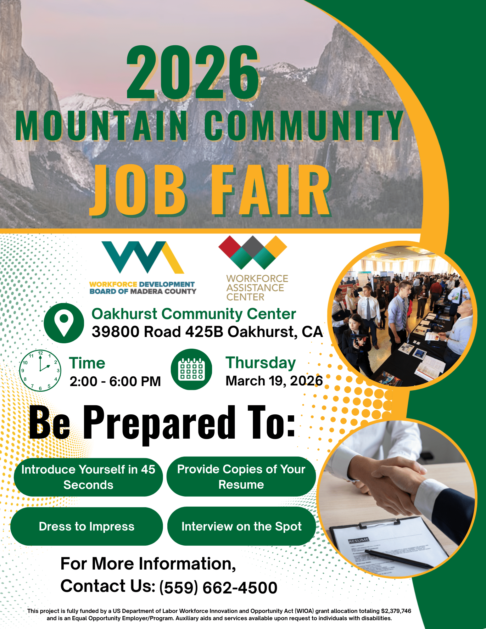 Happening Thursday, March 21, 2024, at the Oakhurst Community Center, 39800 Road 425B, in Oakhurst starting at 2:00 p.m. Have questions? Call or email for all the details: Jorge: 559-662-4540, jespinosa@maderaworkforce.org Erick: 559-662-4528, eflores@maderaworkforce.org
