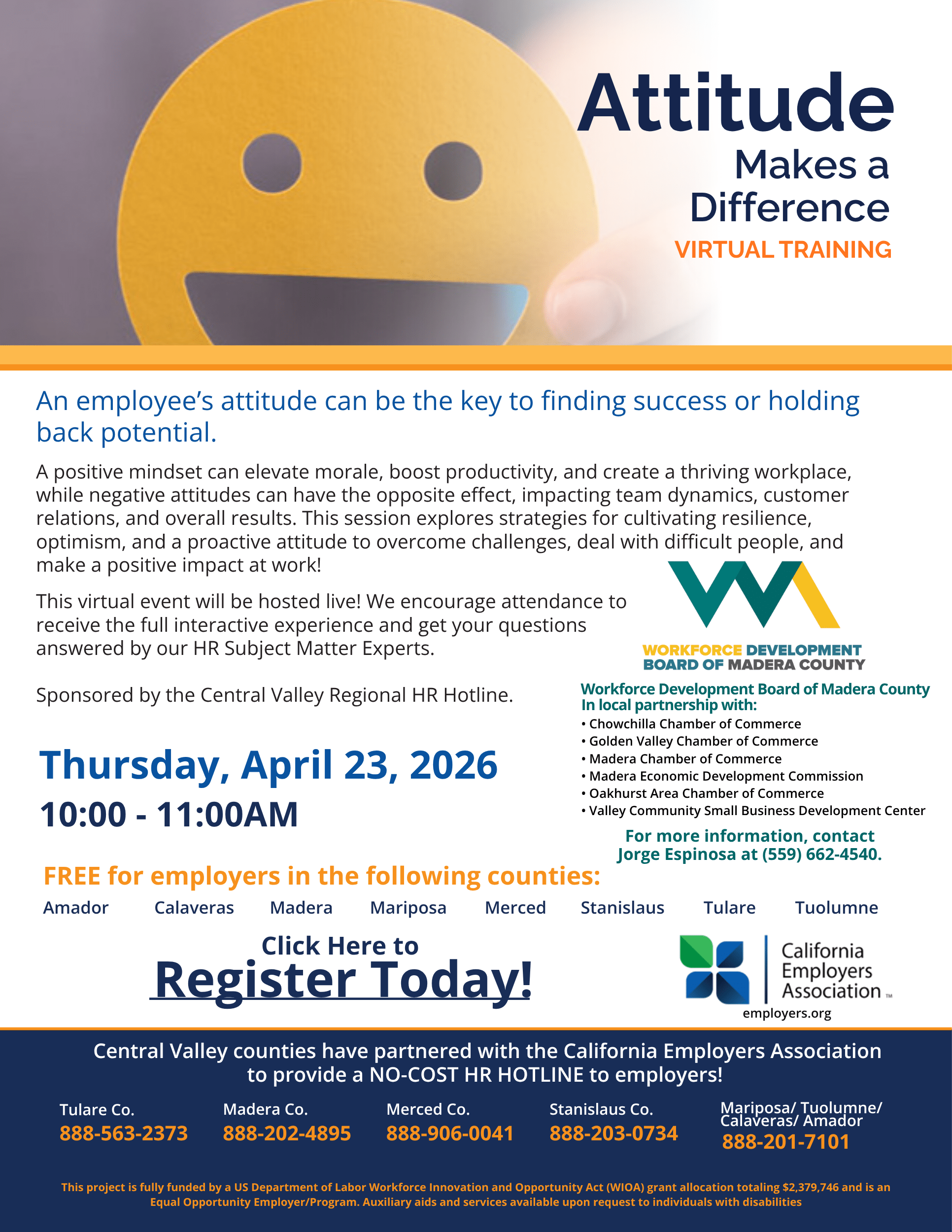 The Workforce Development Board of Madera County and the California Employers Association have partnered to provide HR webinars at NO-COST.